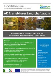 Alle, die sich für dieses Thema interessieren, eine erste Projektidee zum Thema “Erlebbarer Landschaftsraum BiggeLand” haben oder sich mit anderen Akteuren aus der Region austauschen möchten, sind herzlich eingeladen! Neben der Information geht es darum, kreativ zu werden, an Ideen zu arbeiten und miteinander zu diskutieren. Hier erhalten Sie das Programm als Pdf zum Download.