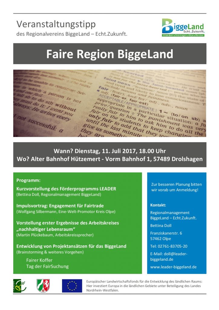 Nachhaltige Themen wie Energieeffizienz, Fairer Handel und soziale Gerechtigkeit wurden schon im Rahmen der Bewerbung um das Förderprogramm LEADER diskutiert. In den kommenden Jahren möchte die LEADER-Region BiggeLand diese Themen durch Projekte vor Ort umsetzen. Als mittelfristiges Ziel wird unter anderem die Zertifizierung zur Fairtrade Region angestrebt.